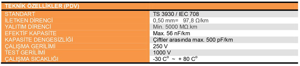 Kullanım Alanları (PDV): Bina içlerinde sabit tesisatlarda telefon hatlarında abone dağıtım kablosu olarak kullanılır.